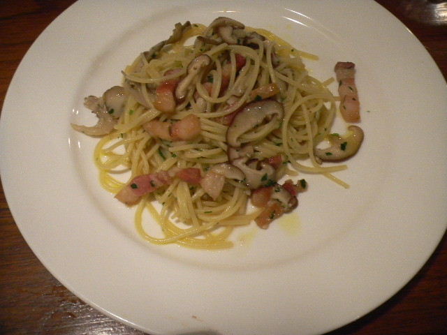 パンチェッタ(pancetta)と茸の、ペペロンチーノ(aglio, olio e peperoncino)。
