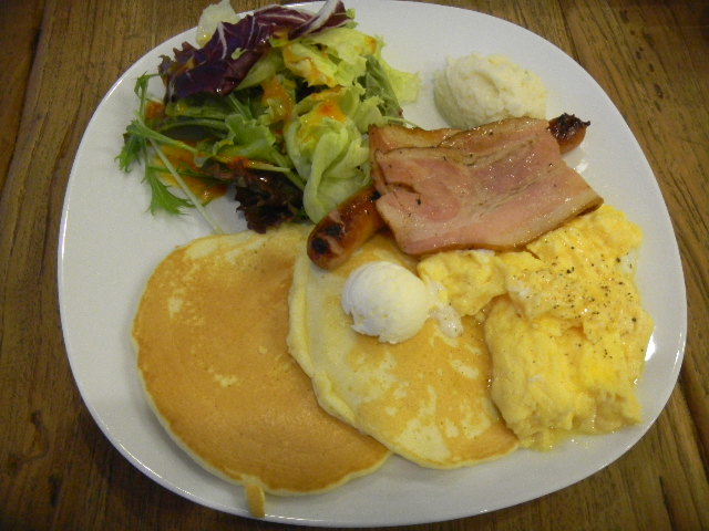 写真以下2枚。ブランチ(brunch)皿。パンケーキ(pancake)には、お好みで(好きな量)、メープルシロップ(maple syrup)をかけて食べます。やや、観光地価格ですが、ソーセージ(sausage)等、一つ、一つの質が高く、美味しいです。