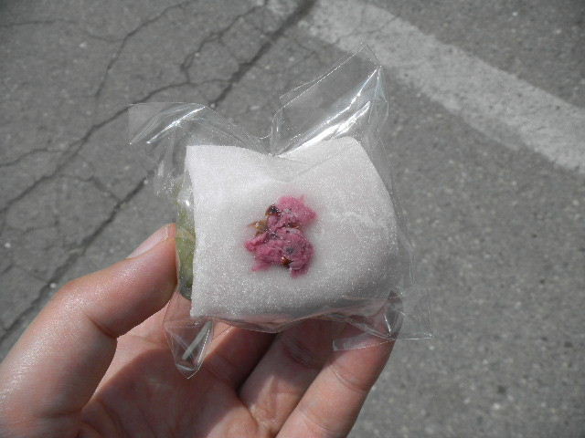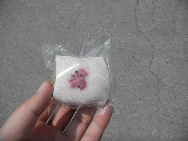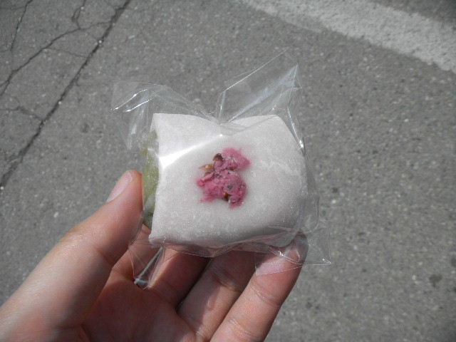 写真以下3枚。この時、上田(ueda)城(castle)跡(上田(ueda)城(castle)の跡)の屋台で買って、一個ずつ食べた、桜をイメージした、抹茶(緑茶・green tea)クリーム(cream)大福(daifuku)。少し、西洋的な要素が入った、大福(daifuku)と言った感じです(大福(daifuku)は、餅で、甘い餡を包んだ、饅頭型の、日本の伝統的な、甘い、大衆菓子です)。この時、上田(ueda)城(castle)跡(上田(ueda)城(castle)の跡)の桜は、調度、見頃であり、(現在は、公園として整備されている)上田(ueda)城(castle)跡(上田(ueda)城(castle)の跡)には、たくさんの屋台が出ていました。