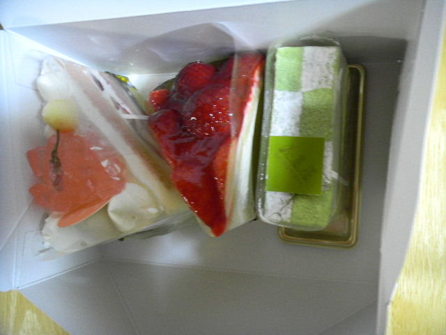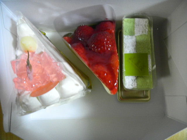 写真以下2枚。別荘周辺の中心市街地((私の別荘がある)長野(nagano)県の中南部の高原地帯の、中心地となっている、人口5万人程の小都市、茅野(chino)市の、市街地)の、ケーキ(cake)・菓子店(地元の女性達に、人気と言った感じの、小綺麗な、ケーキ(cake)・菓子店です)の、ケーキ(cake)。桜の、ショートケーキ(日本式shortcake)、苺のケーキ(cake)、抹茶(緑茶・green tea)のケーキ(cake)。三つ共、二人で分けて食べました。