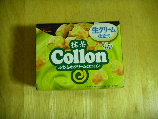 Glico(日本の大規模菓子会社の一つ。1922年創業)の、古くから販売されている、クッキー(cookie)菓子商品、Collon。これは、抹茶(緑茶・green tea)のクリーム(cream)の、Collon。