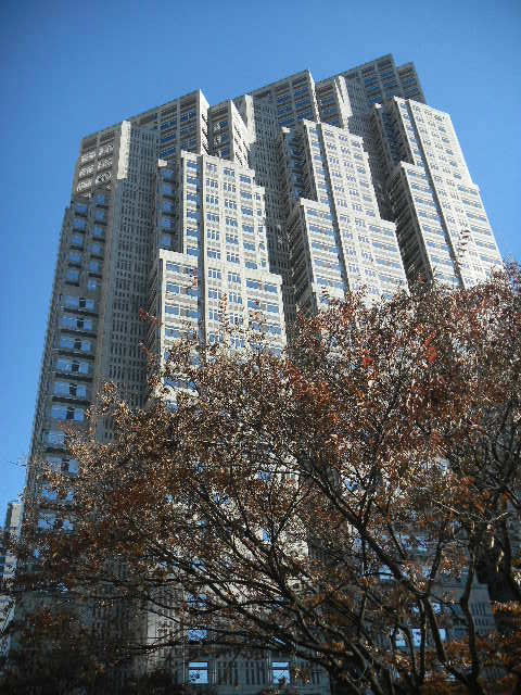 写真以下3枚。東京都庁ビル。東京都庁ビルは、東京都(日本の47の都道府県(prefecture)の内の一つ。主に、東京中心部(東京23区)と東京の西部郊外・近郊から成る)の庁舎(government building)となっているビルで、東京都庁第一本庁舎ビル、東京都庁第二本庁舎ビル等から成ります。設計は、丹下健三(Tange Kenzo)(下の補足説明参照)です。ちなみに、東京都庁ビルを設計した丹下健三(Tange Kenzo)は、シンガポール(Singapore)で、最も高い三つのビルの内、二つの設計を手掛けています(OUB center(1986年完成)、UOB plaza one(1995年完成))。シンガポール(Singapore)のスカイライン(skyline)で、目立つビルのデザイン(design)の傾向が、何となく、東京都庁ビルに似ているのは、その為です。ちなみに、シンガポール(Singapore)で、最も高い三つのビルの内、残りの一つ(republic plaza。1995年に完成)は、丹下健三(Tange Kenzo)弟子であり、日本の、世界最高水準の建築家の一人で有る、黒川 紀章(kurokawa kisyo)が、設計しました。