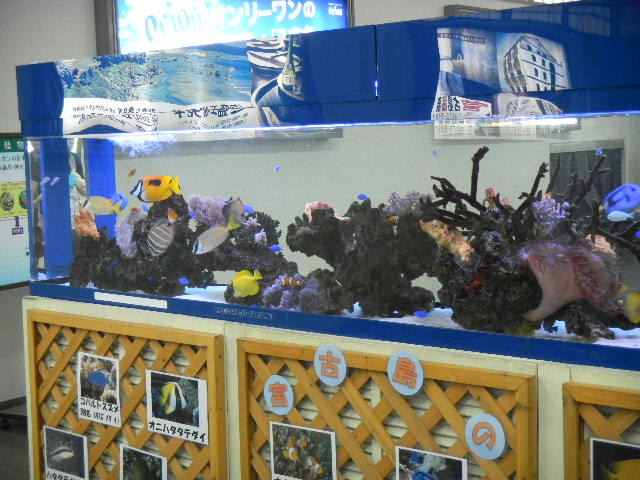 宮古(miyako)島の海に生息する魚の展示。宮古(miyako)島では、(スキューバダイビング(scuba diving)をしなくても)、気軽なシュノーケリング(snorkeling)で、この様な、魚達を見る事が出来ます。