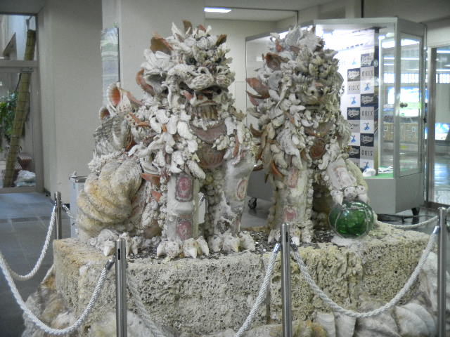 写真以下2枚。宮古(miyako)島で採れた(おそらく。。。)、貝殻を使って作られた、シーサー(shisa)(沖縄(okinawa)県で見られる伝説の獣の像。住宅や、その他の建物の門や屋根、村落の高台などに据え付けられ、家や人、村に災いをもたらす悪霊を追い払う魔除けの意味を持つ。説明は、wikiを参考にしました(ほぼ、引用))。