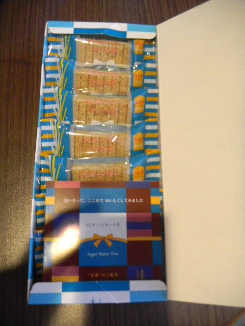 写真以下3枚。行きに、東京の、羽田(haneda)空港で買った、お菓子。シュガー(sugar)バター(butter)の木と言う、日本の、西洋菓子。ホワイトチョコレート(white chocolate)を、バター(butter)と砂糖で味付けをして焼いたシリアル(cereal)で挟んだ、お菓子です。シュガー(sugar)バター(butter)の木は、この時、初めて食べましたが、まあ、普通と言った感じでした(まあ、美味しかったけど、特別、美味しいと言う程ではなく、平凡と言った感じ。。。)。