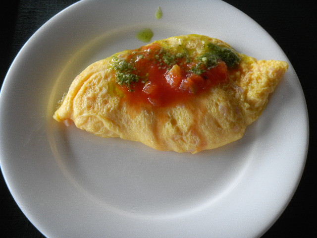 ハム(ham)、チーズ(cheese)入りの、オムレツ(omelette)。緑色の物は、バジル(basil)のソース(sauce)です。オムレツ(omelette)は、実演方式(バイキング(buffet)において、あらかじめ作った物を置いておくのではなく、コック(cook)が、その場で、料理を作る形式)です。オムレツ(omelette)は、もう一つ食べました(もう一つ食べたオムレツ(omelette)は、彼女の真似をして、チーズ(cheese)だけ入った、オムレツ(omelette)を作って貰い、(サラダ(salad)用の)、粉チーズ(cheese)とマンゴー(mango)のドレッシング(dressing)をかけて食べました(美味しかったです))。