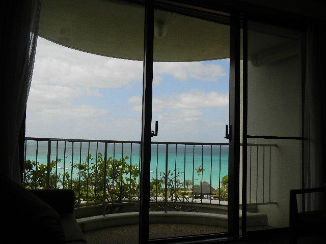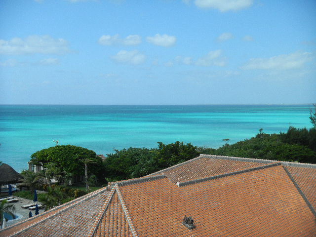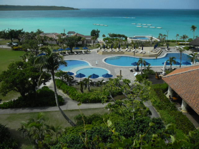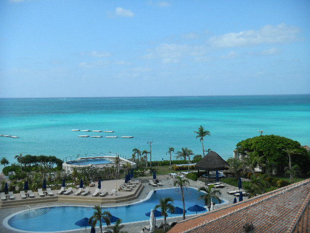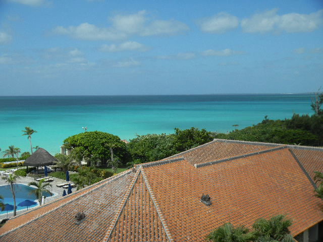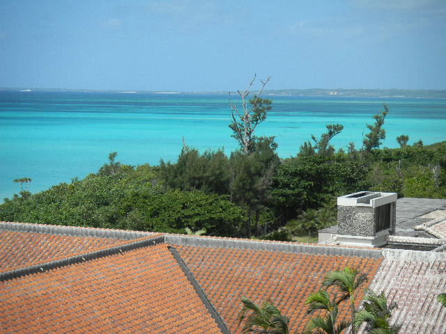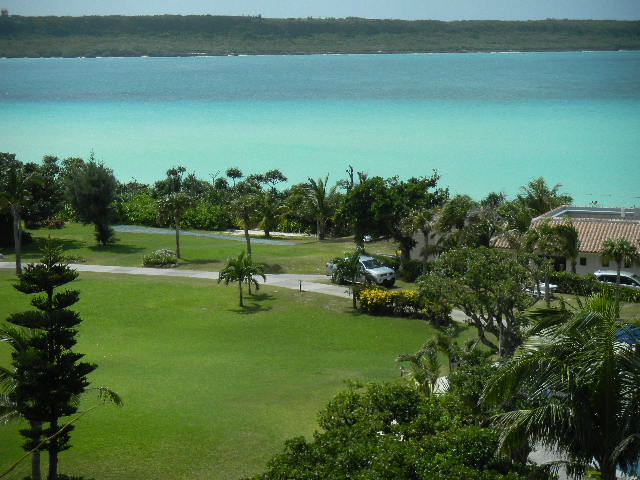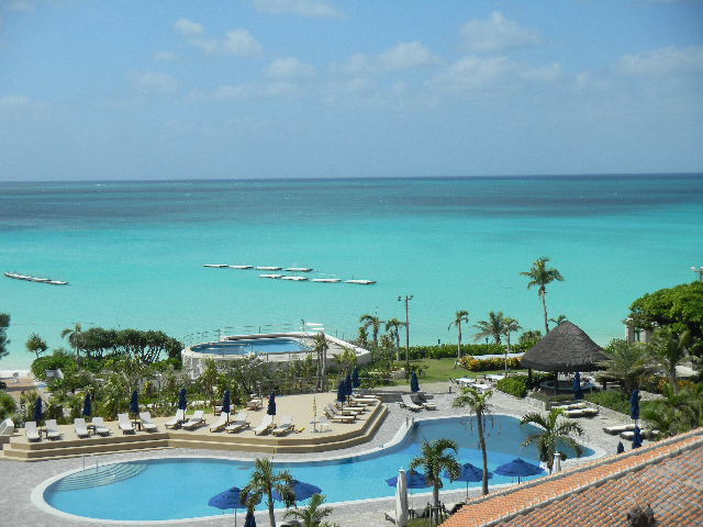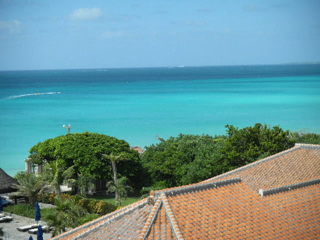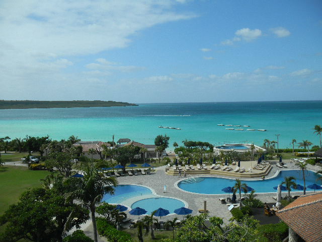 写真以下3枚。この日の朝、ホテルの客室(この時。私達が、宿泊した客室)の、バルコニー(balcony)から見た景色。この日の朝は、残念ながら曇り。晴れていれば、海の色は。これよりも、ずっと綺麗です(まあ、曇りでも、海の色が、これだけ綺麗に見えると言う事は、凄い事だと思います)。
