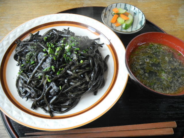 私が食べた、イカ(烏賊)墨、蛸(地元産の蛸)、焼き蕎麦。イカ(烏賊)墨は、沖縄(okinawa)県で、よく使われる食材の一つとなっています。私は、美味しいと思いましたが(特別美味しいと言う程では、全くない)、彼女に、少し、味見をさせたら、「それ程でも。。。(それ程、美味しくない)」と言っていました。