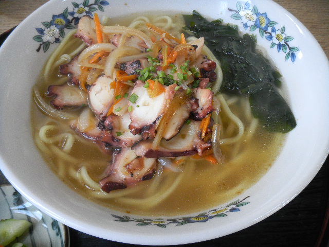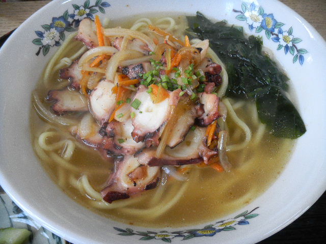 写真以下2枚。彼女が食べた、蛸(地元産の蛸)が具の、沖縄(okinawa)蕎麦(沖縄(okinawa)料理の一つで、沖縄(okinawa)県で、非常に、よく食べられている軽食。沖縄(okinawa)を代表する、大衆食の一つ)。この様な、蛸が具の、沖縄(okinawa)蕎麦は、珍しいと思います(私が知る限り、標準的な、沖縄(okinawa)蕎麦の、主な具は、豚肉の三枚肉の煮物と蒲鉾(kamaboko。魚の練り物)です)。この辺り(池間(ikema)島、及び、池間(ikema)島周辺(宮古(miyako)島の、北端部area))は、昔から、蛸が、よく食べられている(料理の食材として、蛸が、よく使われている)様です。彼女は、蛸は、嫌いではありませんが(蛸が、嫌いならば、これを選ばない)、この、蛸が具の、沖縄(okinawa)蕎麦は、美味しくないと言っていました(彼女に、少し味見をさせて貰いましたが、私は、個人的には、まあ、普通(特に、美味しくもなければ、特に、不味くもない)と言った感じでした)。この食堂、古くから、地元の人々や観光客の間で、有名な(人気が高い)店の様ですが、少し残念。。。(彼女は、かなり、残念と思った様ですw)。