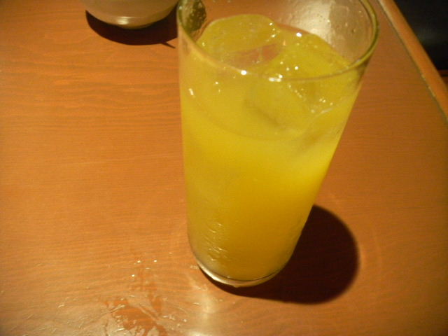ウオッカ(vodka)、マンゴー(mango)ジュース(juice)、パイナップル(pineapple)ジュース(juice)、オレンジ(orange)ジュース(juice)、緑茶(green tea)、ソーダ(炭酸水)の、組み合わせの、カクテル(co・cktail)(この、居酒屋、独自の、カクテル(co・cktail))。彼女が、この夕食時に飲んだ、お酒(アルコール(alcoholic)飲料)は、これだけ。。。彼女は、アルコール(alcoholic)飲料を飲むのは、嫌いではありませんが、アルコール(alcoholic)は、体質的に、かなり苦手なので、体質的に、アルコール(alcoholic)飲料が、あまり飲めないのを、残念がっています。