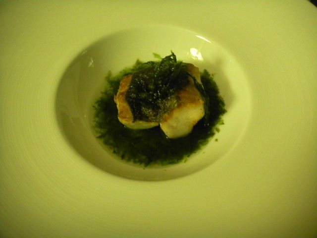 写真以下2枚。魚のメイン(main)料理。神奈川(kanagawa)県の近海産の魚の、ポワレ(poele)。海苔の、ソース(sauce)。