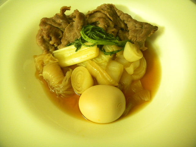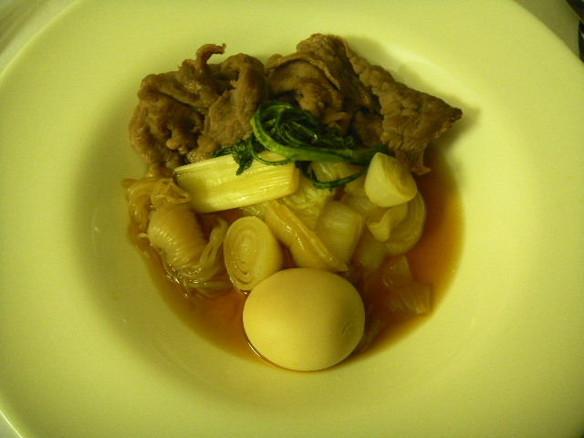 写真以下2枚。肉のメイン(main)料理。神奈川(kanagawa)県産の牛肉の、牛鍋(19世紀半ばに、横浜で生まれた、横浜発祥の牛肉料理)。