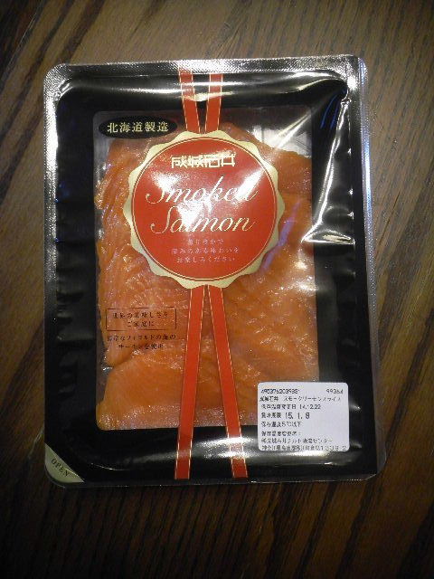 マートの、スモークサーモン(smoked salmon)。一部は、サーモン(salmon)とクリームチーズ(cream cheese)のディップ(dip)の材料として使いました。