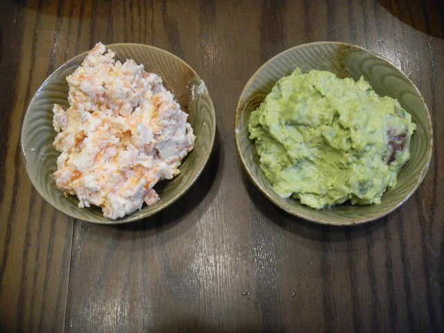 왼쪽, 연어(salmon)와 크림 치즈(cream cheese)의 딥(dip).오른쪽, 아보카드(avocado)의 딥(dip).빵에 얹는 등 해 먹습니다.