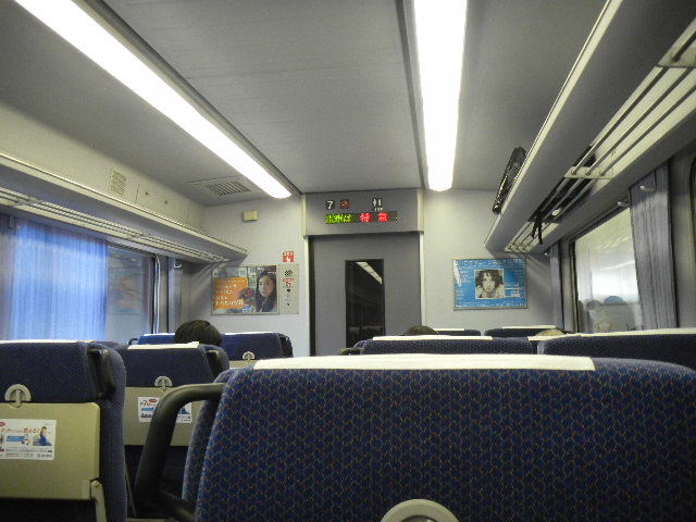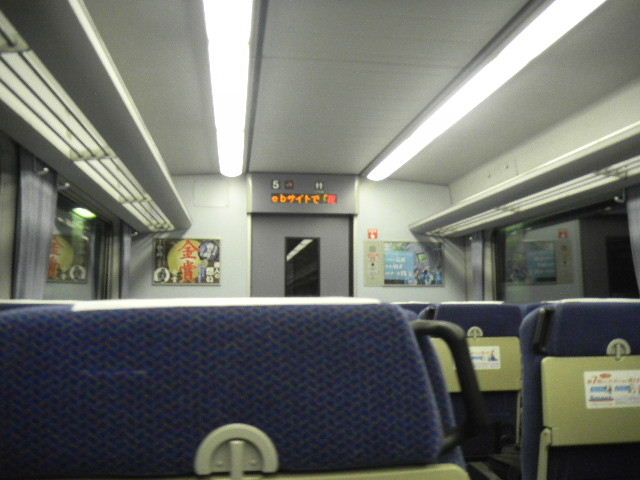 車内の様子。「小江戸(koedo)」に使われている、西武(seibu)鉄道10000系車両(1993年にデビュー(debut)した、西武(seibu)鉄道の、現在の、特別料金が必要な、特急電車(express)専用車両)は、外観だけでなく、内装も、退屈なデザイン(design)ですが、席と席の間(足元)は、比較的、ゆったりとしており、その点においては、乗り心地は、良いです。もちろん、通勤電車の車両よりも、乗り心地が、ずっと良い(乗っていて、ずっと楽)なのは、言うまでもありません。