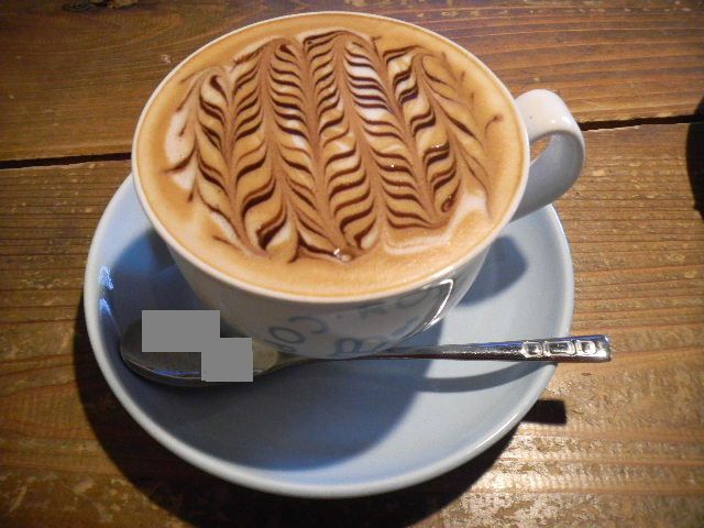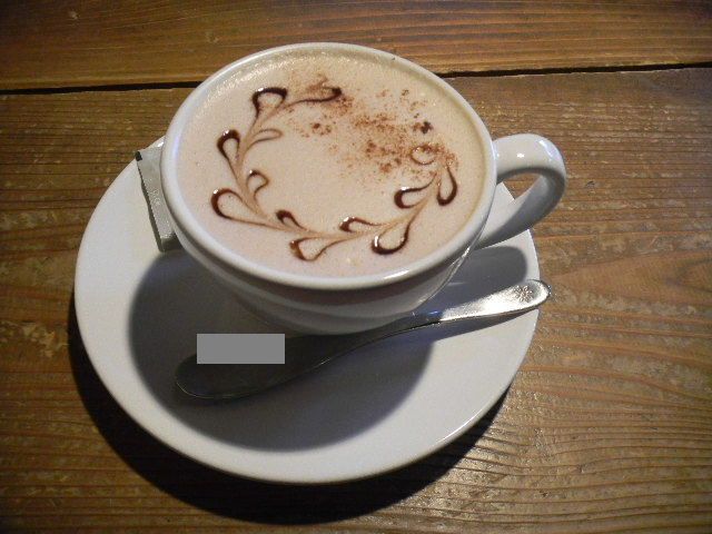 これは、この時、このカフェ(cafe)で、友人が飲んだ、カフェモカ(cafe mocha)の写真を撮影させて貰った物(こちらも、スプーン(spoon)に、私の顔らしき物が、写り込んでしまったので、プライバシー(privacy)保護の為、修正)。