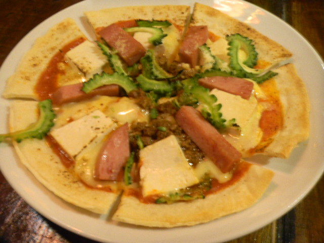 沖縄(okinwa)で、よく使われる、食材が載った、ピザ(pizza)。ゴーヤ(ニガウリ・bitter melon)(沖縄(okinawa)県で、よく食べられている野菜)、島豆腐(生搾り製法で作られる、沖縄(okinawa)県の、水分が少なく硬い豆腐)、缶詰の豚肉(SPAMやTULIP等。沖縄(okinawa)では、ポーク(pork)と呼ばれる事が多い様です)、タコス(taco)・タコライス(Taco-Rice)(下の補足説明参照)の具に使われる挽肉等が載っています。