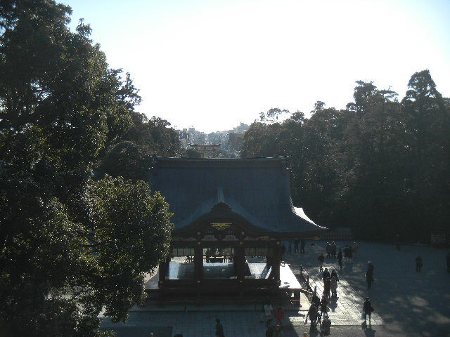 逆光で(写真を撮る方向に、太陽が来てしまった為)、写真が、上手く撮れませんでしたが(写真が、白んでしまいましたが)、鶴岡八幡宮(tsurugaoka hachimangu)から、海の方角を眺める。鶴岡八幡宮(tsurugaoka hachimangu)の正面から、海の方にまっすぐ伸びる、大きな通り、若宮大路(wakamiyaooji)(写真中央部に見える通り。下の補足説明参照)を、自動車でまっすぐに進むと、海に突き当り、海の景色が、大きく広がります。