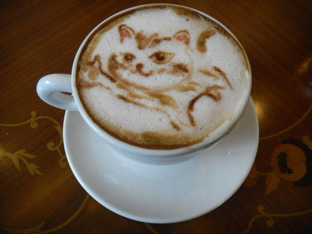 このカフェ(cafe)で、この時、私が飲んだ、飲み物。ヘーゼルナッツ(Hazelnut)ラテ(Latte)。ラテアート(latte art)は、猫を描いてくれるように、頼みました。