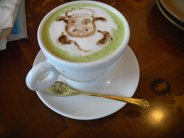 このカフェ(cafe)で、この時、彼女が飲んだ、飲み物。抹茶(Green Tea)ラテ(Latte)。彼女は、ラテアート(latte art)は、今年の干支である、羊を描いてくれるように、頼みました。うーん、猫の方が、上手ですね。