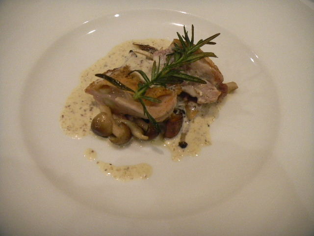 肉の、メイン(main)料理。阿波尾鶏(awao鶏)(下の、補足説明参照)の、香草ロースト(焼き物)、茸の、軽い、クリーム(cream)ソース(sauce)。