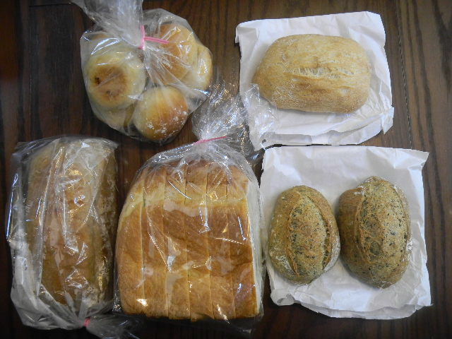 よく利用する、私の街の、お気に入りの手作りパン店の一つのパン。写真右下は、海藻(seaweed)入りのパンです(美味しいです)。
