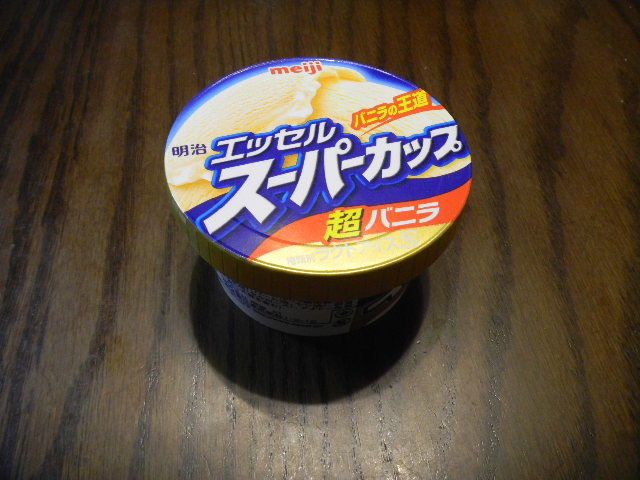 写真以下4枚。「スーパーカップ(super cup」の、バニラ(vanilla)アイスクリーム(ice cream)。「スーパーカップ(super cup」は、日本の、とてもチープな(とても安い)、大量生産のアイスクリーム(ice cream)の中で、代表的な物の一つとなっています。