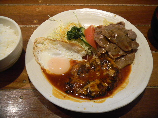 写真以下2枚。この食堂・レストラン(私の街の、北の隣街の、大衆的な、洋食(yoshoku)(日本で、近代以降、日本に合う様に、(日本人の視点からすれば)改良された西洋料理)食堂・レストラン)で食べた、この日の昼食。ハンバーグ(hamburger steak)と、豚肉の生姜焼き(日本の庶民的な、豚肉料理で、豚肉の、焼き物料理)(皿の右上)の、組み合わせメニュー(menu)。これに、ご飯(rice)と、味噌汁(miso soup)が付きます。この食堂・レストランは、料理の味は、全般的に、普通と言った感じですが、値段が安くて、良心的な所が良く、時々、利用しています。