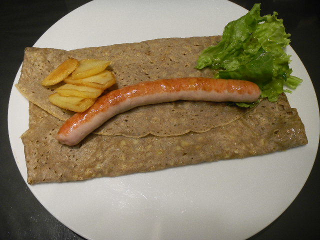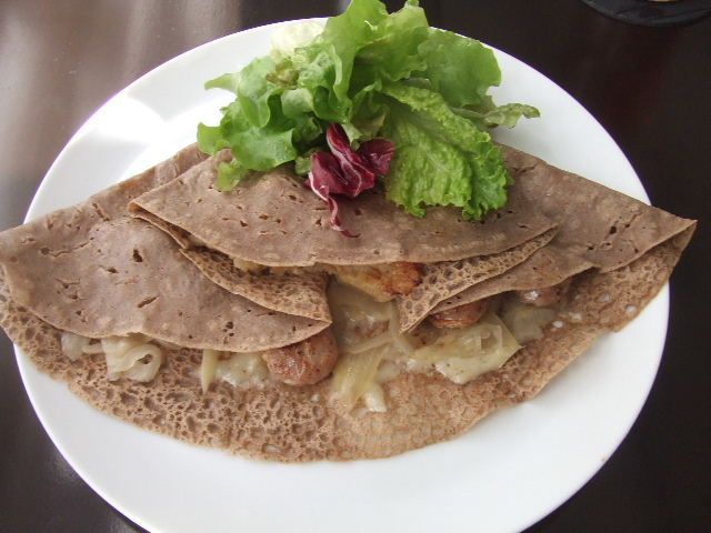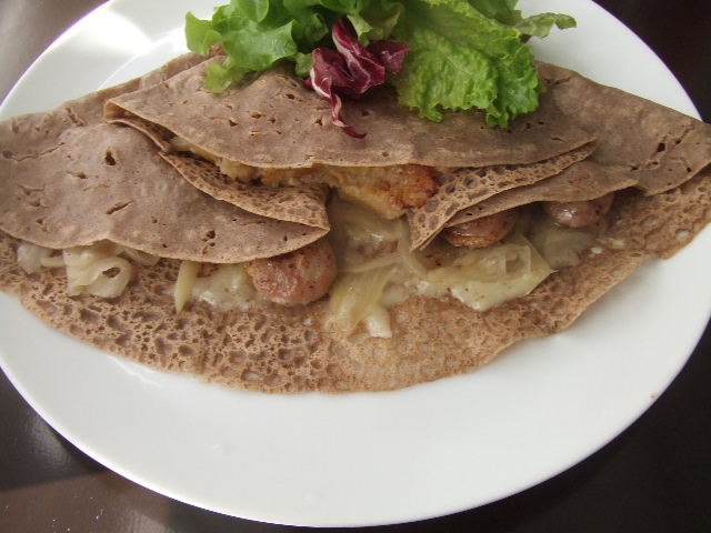 私が食べた、ソーセージ(sausage)と、オニオン(onion)のシードル(cidre)煮、グリエールチーズ(Gruyere)のガレット(galette)。