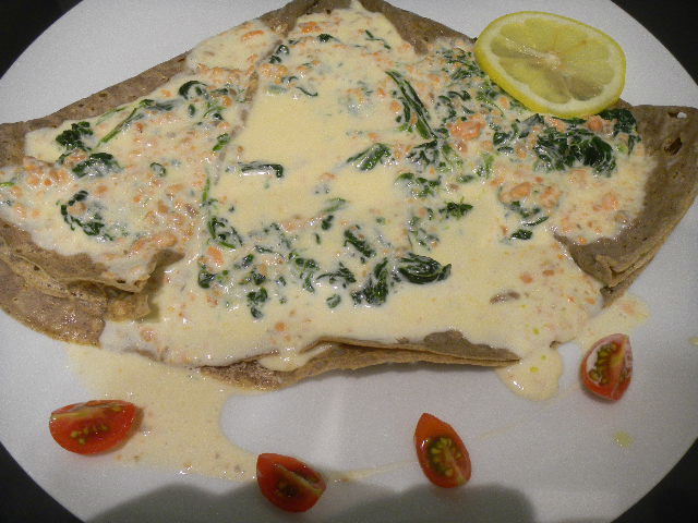 彼女が食べた、サーモン(salmon)と、ホウレン草(spinach)、白ワイン(wine)風味の、クリーム(cream)ソース(sauce)のガレット(galette)。