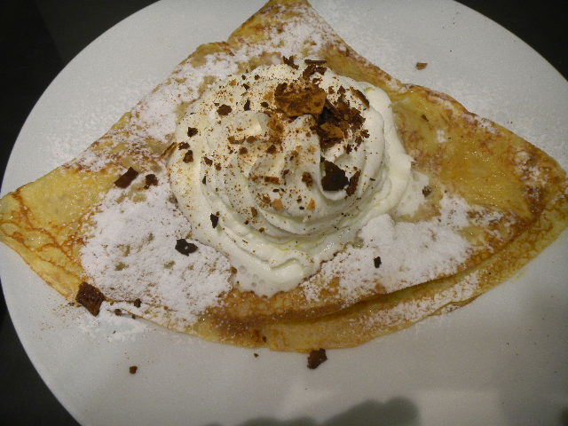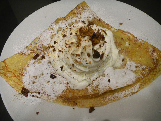 写真以下2枚。彼女が食べた、林檎の煮物のクレープ(crepe)、生クリーム(cream)のトッピング(topping)。