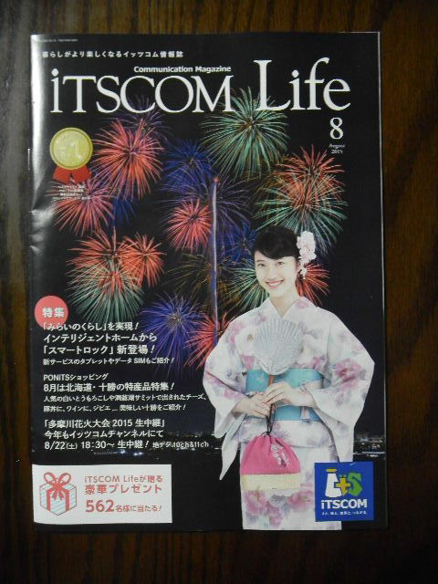 か なり前に、撮影した写真ですが(7月に撮影した写真ですが)、我が家が利用している、ケーブルテレビ(cable television)会社の、利用者向けの、情報誌の、2015年8月号。表紙は、花火大会(花火祭り)を、イメージした物になっています。日本人は、 非常に、花火が、好きで、日本では、夏に、非常に多くの、花火大会(花火祭り)が開催されます。新しく調べるのは、面倒なので、(新しく)調べるのは省略 しますが、私が、2010年に、netで、軽く調べた所、2010年の、夏から初秋にかけては、日本全国で、600以上の花火大会(花火祭り)が開催され ていた様です。また、日本では、夏に、花火大会(花火祭り)以外の、通常の祭りも、非常に、たくさん開催されます(日本では、夏に開催される祭りの事を、 夏祭りと言います)。例えば、私が暮らす、渋谷(shibuya)区(東京中心部(東京23区)を構成する、23の区の内の一つ。東京中心部(東京23 区)の西部に位置する)だけでも、(夏に、渋谷(shibuya)区内の各地域で、祭りが行われ)、7月の後半から8月にかけて、30近い、夏祭り(夏に 開催される、花火大会(花火祭り)以外の、通常の祭り)が行われます。日本では、多くの女性が、夏から初秋にかけて、夏祭り(夏に開催される、花火大会 (花火祭り)以外の、通常の祭り。ただし、夏祭りと、花火大会(花火祭り)の区分が曖昧な場合もある)と、花火大会(花火祭り)に、遊びに行く際に、浴衣 (yukata)(夏用の、簡易な、着物(kimono)(日本の伝統衣装))を着ます。