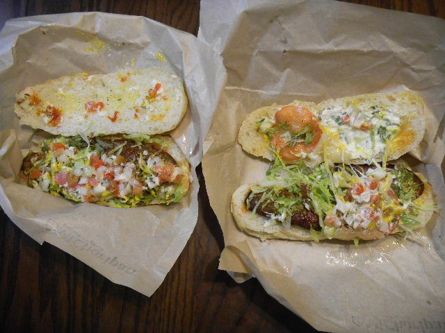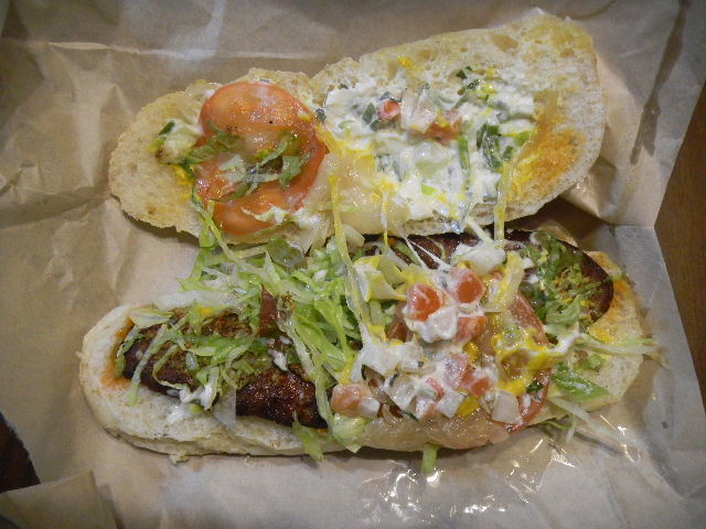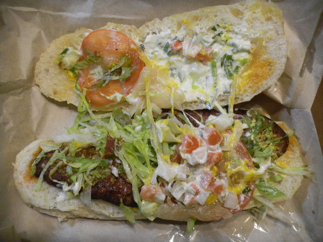 写真以下5枚。この日、我が家で、一人で 食べた夕食。たまに利用する、私の街の、choripan専門店の、choripan(宅配(delivery)を頼んだ物)。昼食として食べるならば、 1つでも十分ですが、この時は、夕食として食べたので、2つ。チョリソ(chorizo)以外の具の内容も、それぞれ異なりますが、一つは、牛肉だけを 使ったチョリソ(chorizo)を挟んだchoripanで、もう一つは、牛肉と豚肉を使ったチョリソ(chorizo)を挟んだchoripanで す。
