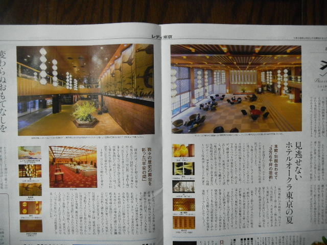 ホ テルokuraの広告より。。。ホテルokuraのロビー(lobby)と、ホテルokuraの建物の、日本の伝統的なデザイン(design)が取り 入れられた、意匠(design・装飾)の例(ホテルokuraの建物は、所々に、日本の伝統的なデザイン(design)が取り入れられています)。写 真右側の上側は、(1962年に完成した)ホテルokuraの本館の、ロビー(lobby)(設計は、谷口 吉郎(taniguchi yoshiro))。(1962年に完成した)ホテルokuraの本館の建物は、もうすぐ、失われてしまいます(建て替えの為、もうすぐ(今年の8月末 に)閉館となります。新しい建物は、2019年に完成の予定です)。写真左側の上側は、1973年に完成した、ホテルokuraの新館のロビー (lobby)。ホテルokuraの別館の建物の外観及び内装は、1962年に完成した、ホテルokuraの本館の建物に準じた物となっています (1962年に完成した、ホテルokuraの本館の建物に合わせた物となっています)。したがって、ホテルokuraの別館の建物は、1970年代初めに 完成した建物ですが、(1962年に完成した、ホテルokuraの本館の建物同様)、1960年代の、(日本の伝統的なデザイン(design)を取り入 れた)日本の現代建築の雰囲気を、現在に伝える物となっています。前述の通り、1962年に完成した、ホテルokuraの、本館の建物は、建て替えの為、 もうすぐ(今年の8月末に)閉館となるのですが(新しい建物は、2019年に完成の予定です)、ホテルokuraの、本館の建物の建て替え期間中は、ホテ ルokuraは、少し、手狭になりますが、(ホテルokuraの)本館の建物の飲食店・施設等の一部を、(ホテルokuraの)別館に移して、(ホテルokuraの)別館のみで営業を行う事となります。なお、本館の建物の建て替え工事が終わった後は、引き続き、(1973年に完成した、ホテルokura の)別館の建物が、建て替えられる可能性、又は、ホテルokuraが、(ホテルokuraの)別館の敷地を売却し、(ホテルokuraの)別館の建物が取 り壊され、跡地に、新しい、高層のオフィス(office)用のビルか、新しい、高層の、富裕層向けマンション(高層の、富裕層向けアパート)が建てられ る可能性は、高いと思います。
