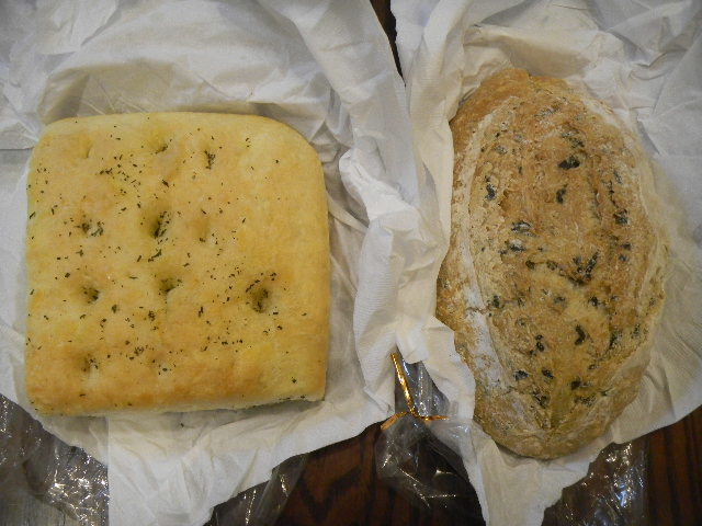 私の街の、お気に入りのフランス料理レストランの一つの、手作りのパン。左側は、フォカッチャ(focaccia)。右側は、海藻(seaweed)入りのパン。