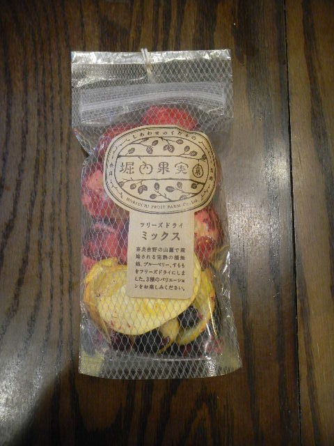 食 後に食べた、お茶菓子の一つ。この前日に、KITTEで、買い物をしたついでに、中川政七(Nakagawa Masashichi)商店(下の、補足説明参照)の、KITTEの店舗で買った、1903年からの歴史を有する、日本の、奈良(nara)県の、果物農 園の、フリーズドライフルーツ(freeze dried fruits)。