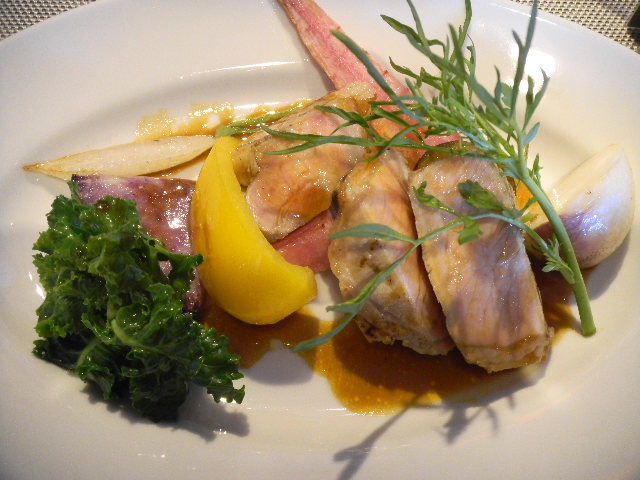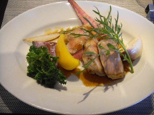 写真以下2枚。メイン(main)料理。国産(日本産)の、高級な豚肉の、焼き物。二人共、同じ、メイン(main)料理(国産(日本産)の、高級な豚肉の、焼き物)を、選びました。