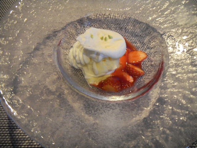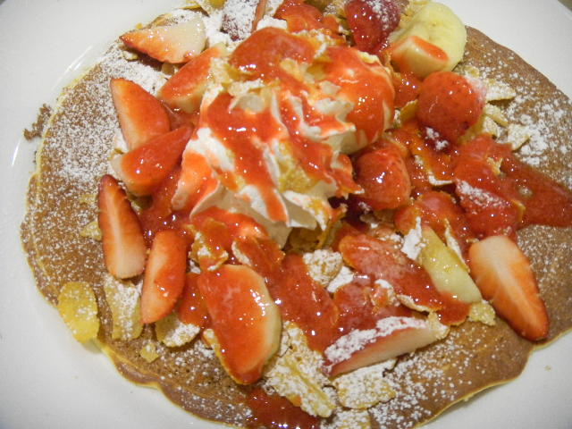 デザート(dessert)は、店を移動して、Denny’s(下の補足説明参照)で食べました。写真は、この時、私が、Denny’sで食べた、苺のデザート(dessert)。彼女は、この時、苺の、サンデー(sundae)を食べました。