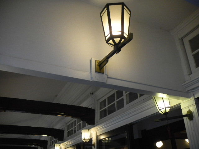 本館(1891年完成)の、中央の階段(写真)の、手すりには、一本の木を、少しずつ湾曲させて作る、曲げ木の技法が、取り入れられています。湿度や、木質によって、微妙に変化する、天然の木を、長い時間、ずれないように、組み合わせるのは、高度な、技術を必要とされます(富士屋(fujiya)ホテルのパンフレット(booklet)の説明文より。。。)