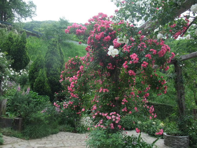 この、薔薇の庭園の、最上部は、日本庭園(日本式、庭園)となっています。写真中央に見えるのは、大きな、盆栽(bonsai)です。大きな、盆栽(bonsai)と言う、存在自体に、少し、矛盾を感じますが。。。w