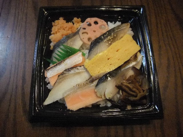 写真以下2枚。マートの、魚(炙り魚)、丼。