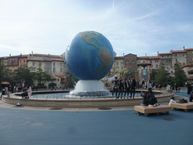 東京disney seaの、入り口を象徴する、建造物である、水が流れる、地球を模した、建造物。調度、偶然に、服装の着こなしを、統一した、男女(男と女)4人組の、若者の、グループ(group)が、写真真ん中よりも、少し右に写りこんでいるので、ついでに説明しますが、現在、日本の、若者達の間では、友人同士のグループ(group)で、服装の着こなしを、(主に)特定のDisneyのキャラクター(character)のイメージに合わせて、統一させて、東京disney resort(東京disney land・東京disney sea)に遊びに行く事が流行しています。この、男女(男と女)4人組の、若者の、グループ(group)は、この日は、おそらく、Mickey Mouse・Minnie Mouseをイメージして、黒(黒色)と白(白色)を基本とした、服の着こなしで、統一して、東京disney seaに遊びに来たのだと思います。