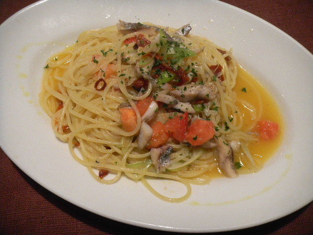 パ スタ(pasta)。鯵と、ドライトマト(dried tomato)の、ペペロンチーノ(aglio, olio e peperoncino)。田舎っぽく(田舎らしく)、オリーブオイル(olive oil)を、たくさん、使い過ぎていて、油っこいですが、まあ、美味しいです。
