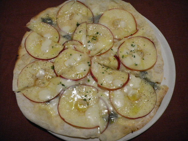 紅玉(林檎の品種の一つ。アップルパイ(apple pie)等に適している)と、ブルーチーズ(blue cheese)の、ピザ(pizza)。長野(nagano)県は、林檎の、主要な産地となっています。