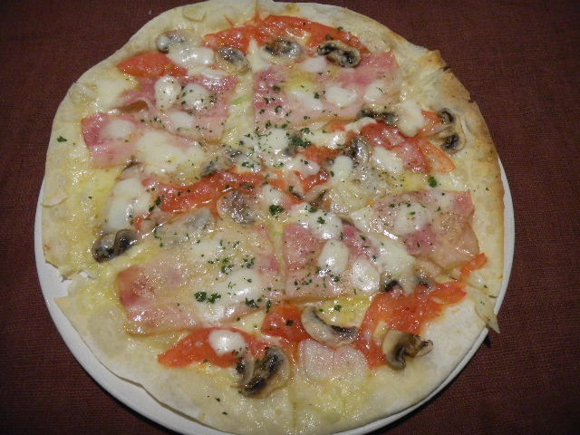 マッシュルーム(mushroom)、ベーコン(bacon)、モッツァレラチーズ(mozzarella)の、ピザ(pizza)。