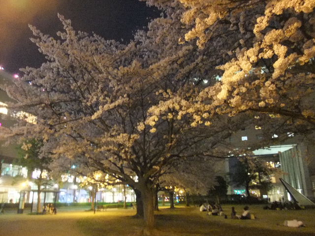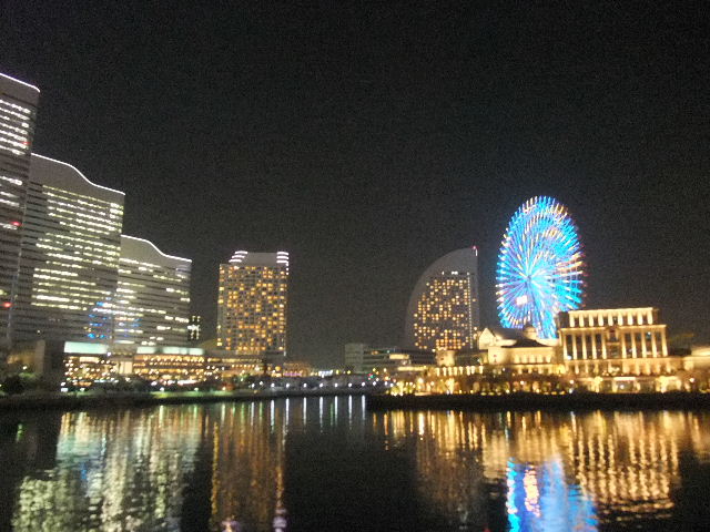 写真以下。レストランで、ゆっくりと夕食を食べた後は、横浜の都心部の海沿いを、夜景と桜の花(夜桜)を見ながら、ゆっくり散歩してから、電車で、東京都心部に帰って来ました。