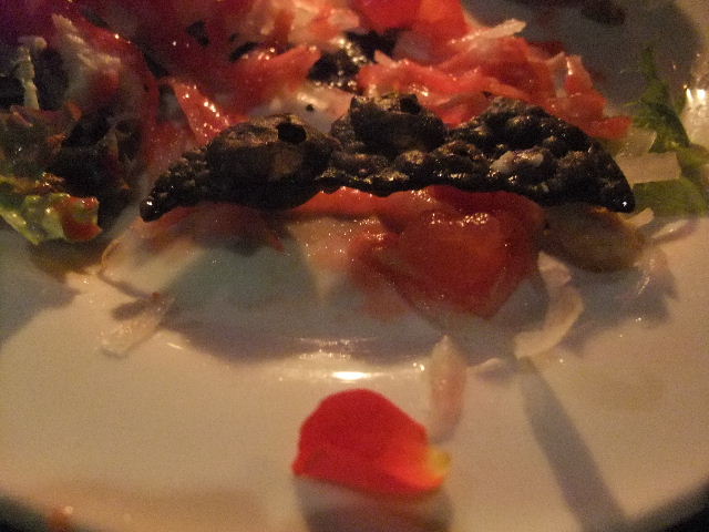 写真以下2枚。温かい前菜。死者に贈る闇のメリークリスマス(ナッツ(木の実)とアンチョビ(anchovy)のガーリックトースト(garlic toast)))。