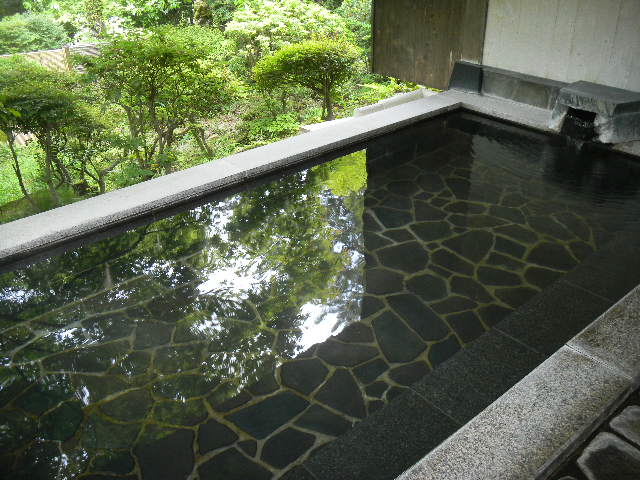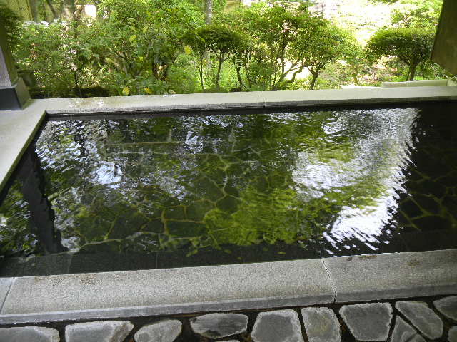 強羅(goura)環翠楼(kansuirou)の温泉風呂は、14室の客室の内、宿泊費が、比較的高い9部屋には、温泉風呂が付いている他に、男用の共同温泉露天(野外)風呂、女用の共同温泉露天(野外)風呂、2つの、屋内(室内)共同温泉風呂(男女別の共同温泉風呂形式だが、2つある、屋内(室内)共同温泉風呂の内、どちらが、男用の共同温泉風呂、どちらが、女用の共同温泉風呂と固定的に決まっている訳ではなく、時間によって、男用の共同温泉風呂と、女用の共同温泉風呂が、入れ替わる形式)があります。この温泉旅館の、温泉の湯は、客室の温泉風呂の湯を含めて、全て、源泉かけ流しのようです。