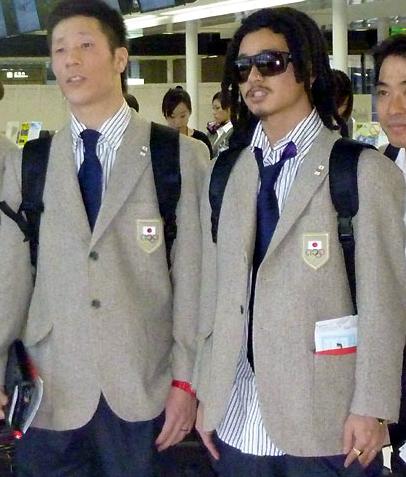 일본 선수단의 공식 블레이저 코트를 입고 있는 것에도 불구하고, 넥타이는 느슨한, 셔츠는 바지로부터 내, 그