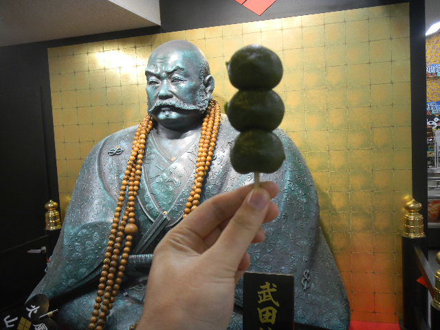 団子。中に、甘い、小豆の餡が入っています。団子の後ろの、像は、武田 信玄(takeda shingen)(下の補足説明参照)の像。
